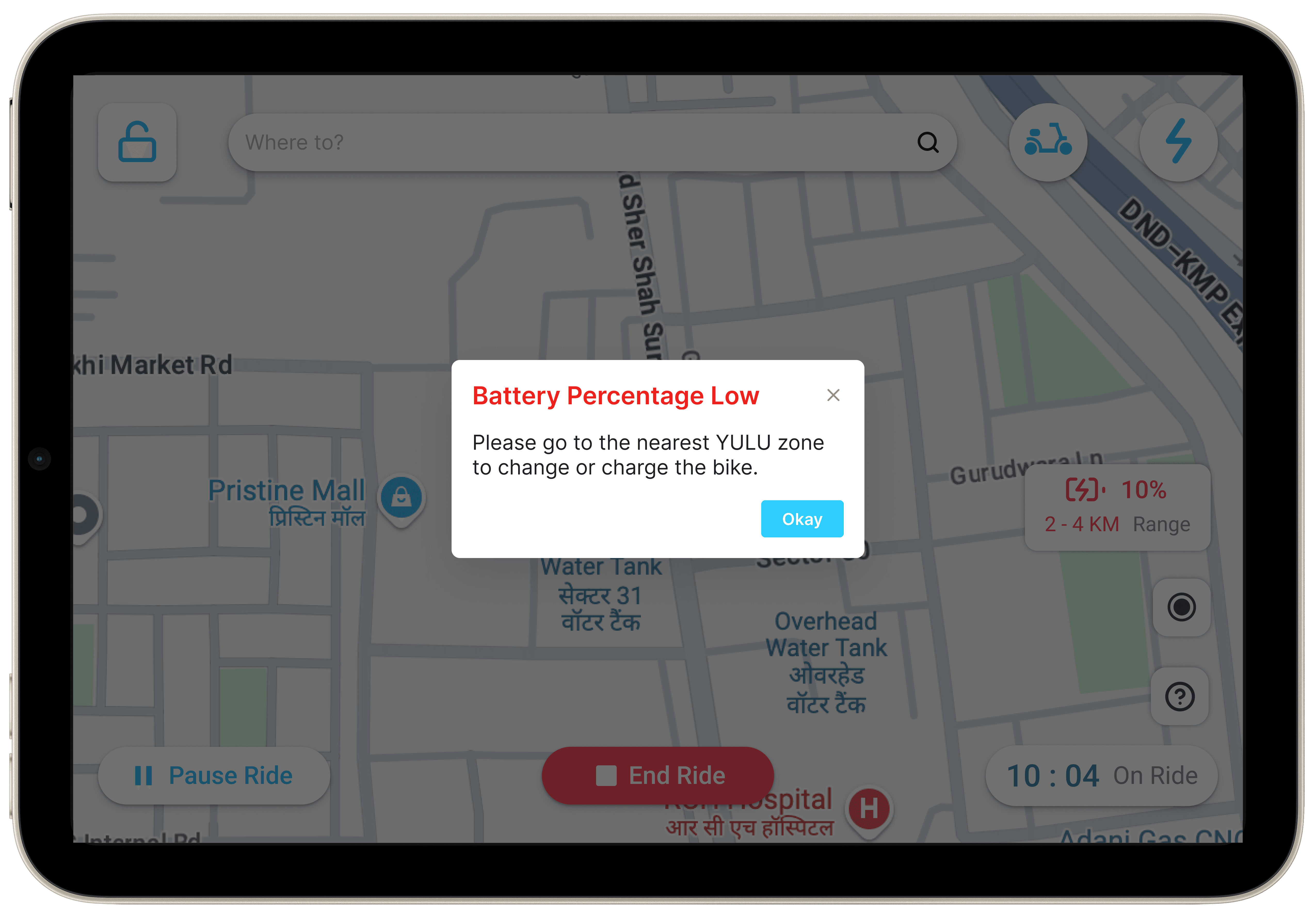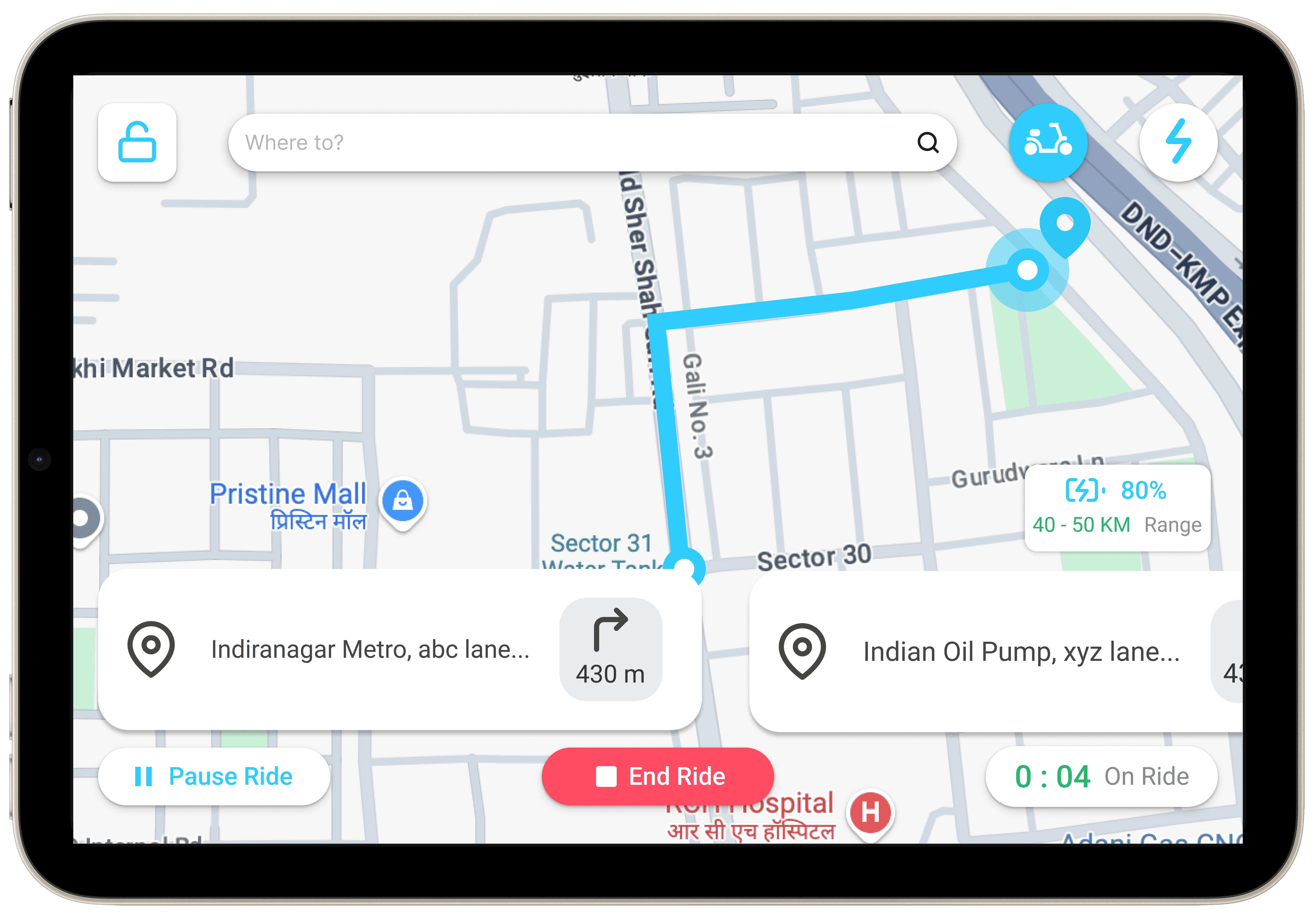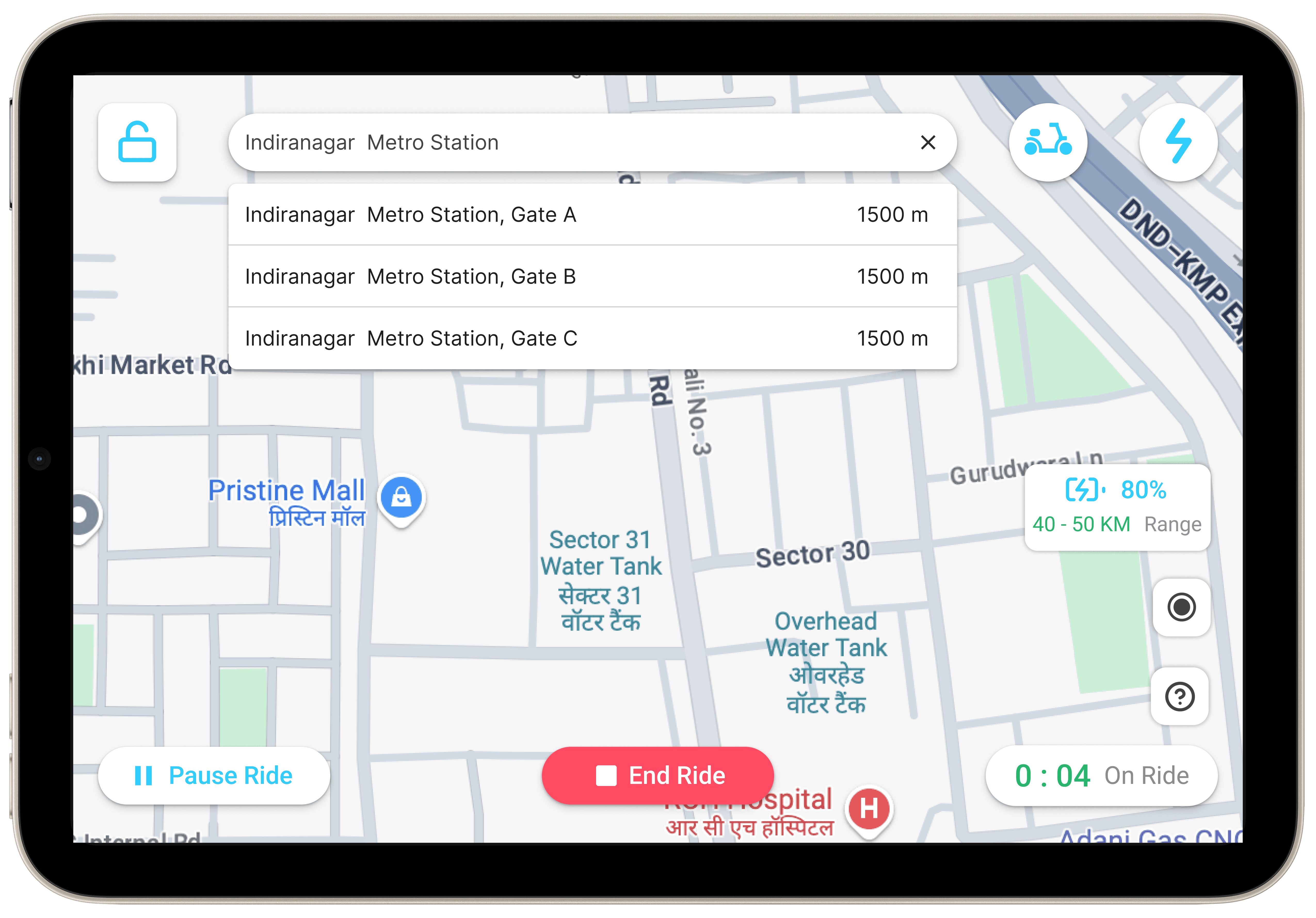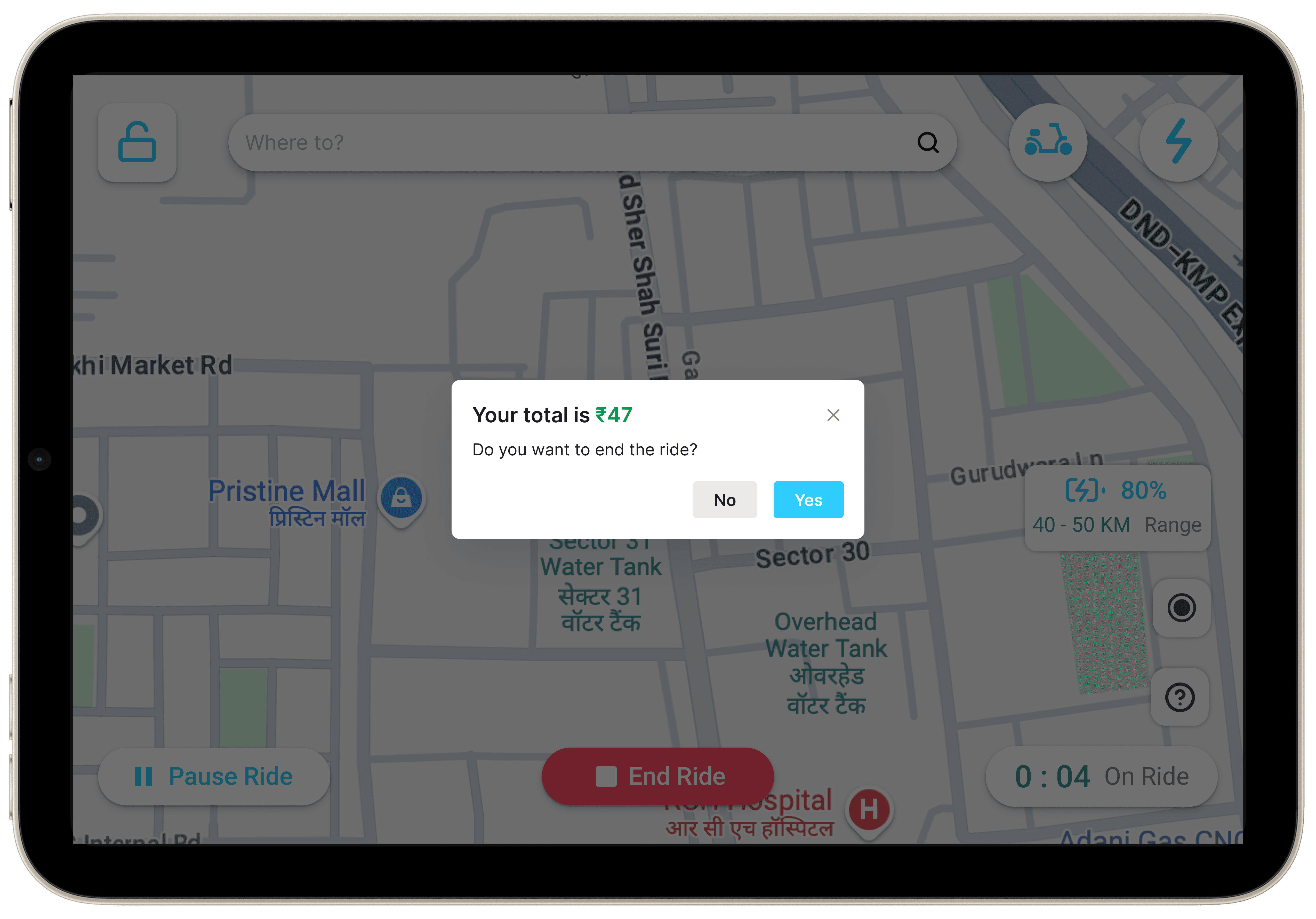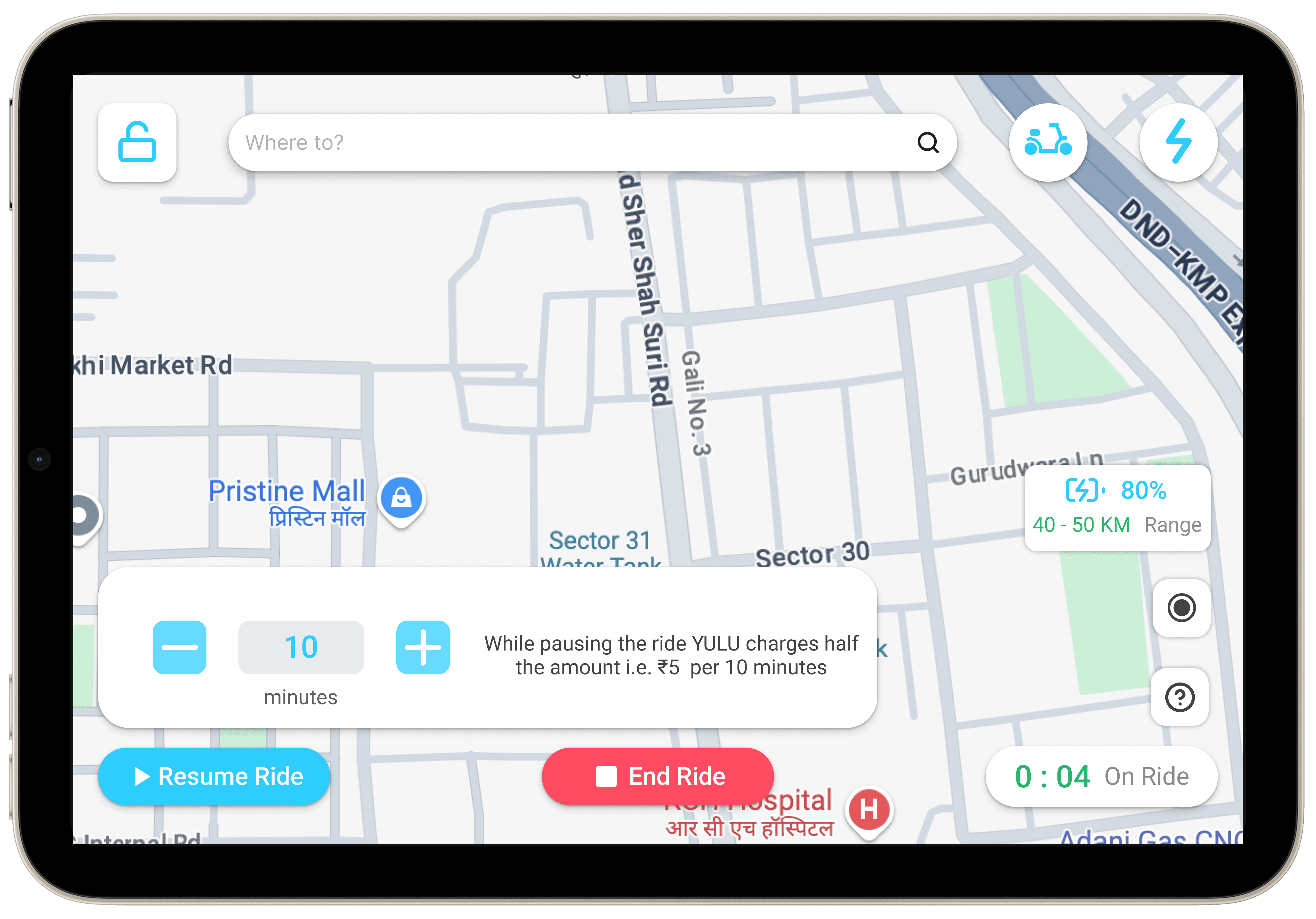 The Pause Ride option lets users pause their ride in 10-minute intervals, reducing the cost by half while the bike is not in use. Interface buttons and text are designed to be larger, ensuring better visibility and usability during the ride.